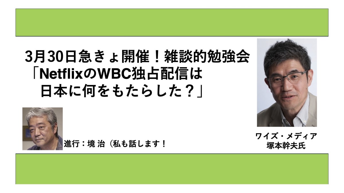 さて今回、地上波テレビでの放送がなかったことで様々な議論を呼びました。NetflixによるWBC独占配信が日本に何をもたらしたのか、みなさんと議論してみたいと思い、急きょ3月30日19時からの”雑談的勉強会”を企画しました。メディアストラテジストとして活躍するワイズ・メディア取締役塚本幹夫さんをお招きし、元テレビ局配信事業担当者として、見解をお聞きします。