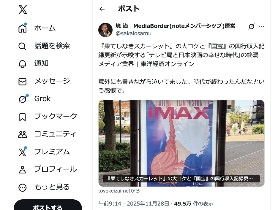 意外にも書きながら泣いてました。時代が終わったんだなという感慨で。 toyokeizai.net/articles/-/920… 『果てしなきスカーレット』の大コケと『国宝』の興行収入記録更新が示唆する「テレビ局と日本映画の幸せな時代」の終焉 11月25日、映画『国宝』が新たな記録を打ち立てた。2003年の『踊る大捜査線 THE MOVIE 2 レインボーブリッ toyokeizai.net