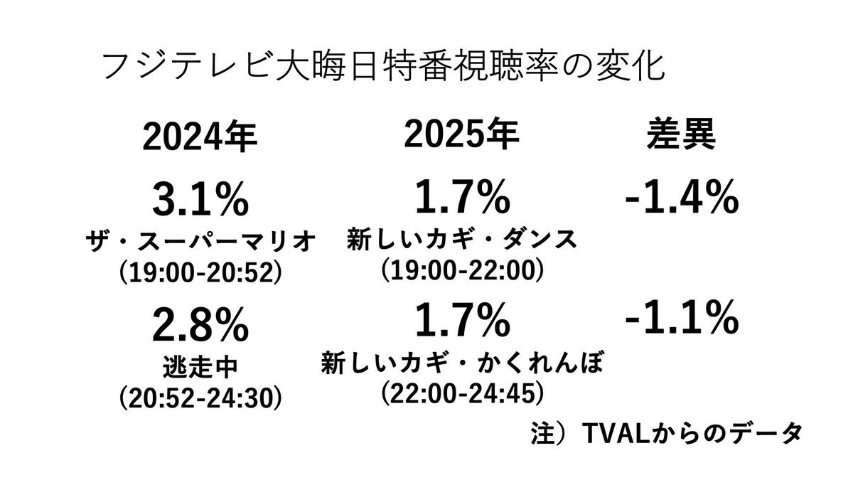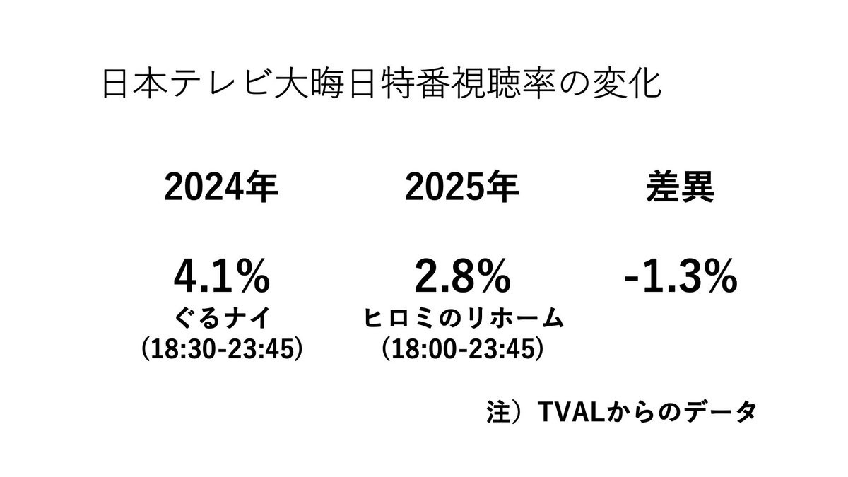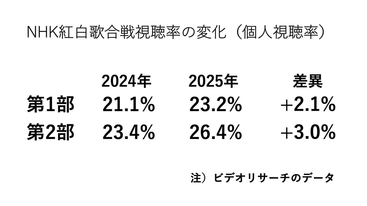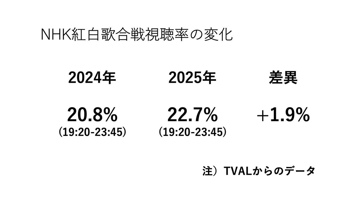 TVALでは第1部と第2部を通した数値が出てきて、上のようになった。その差異は1.9%だ。ビデオリサーチの数値より小さいが、やはり上がっている。民放の2024年と2025年の番組を調べると、テレビ朝日は「ザワつく!大晦日」、TBSも「大晦日オールスター体育祭」、テレビ東京も「年忘れにっぽんの歌」から「孤独のグルメ大晦日スペシャル」への流れで、3局ともほぼ同じ番組だった。視聴率もそれぞれわずかに下がっているがほとんど変わらない。